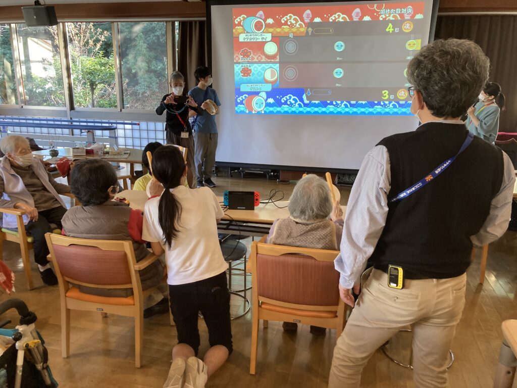 太鼓の達人を使って、対戦曲は「となりのトトロ」で競い合いました。職員の対戦もあり、